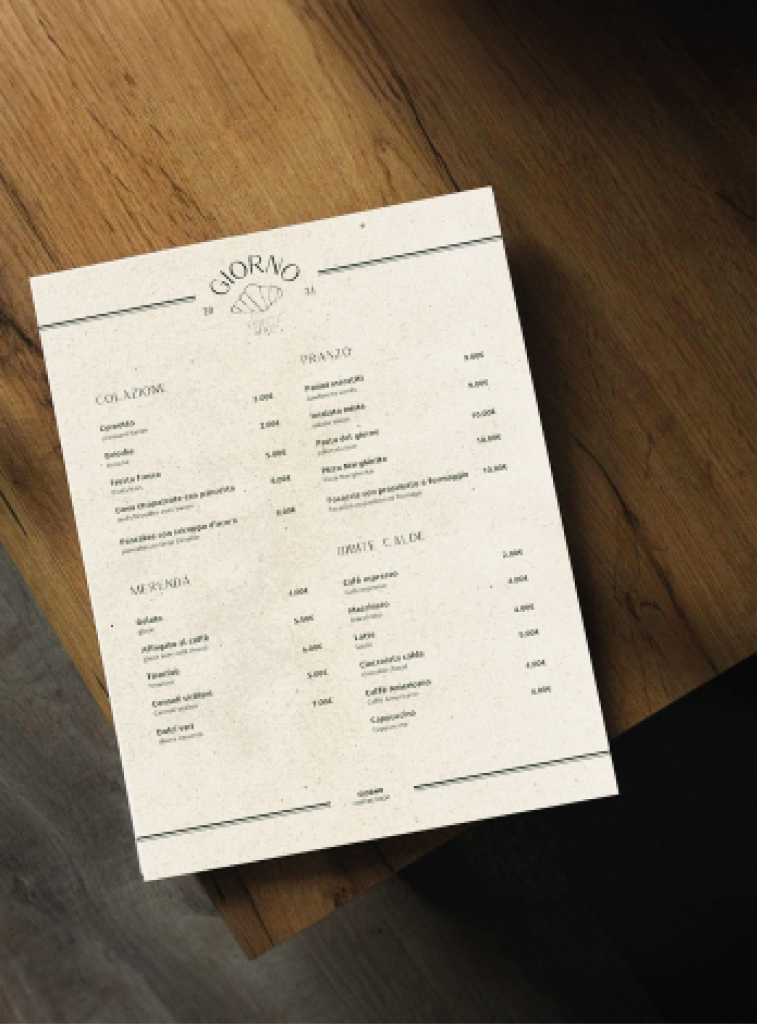 La conception de l’identité visuelle de Giorno avait pour objectif de capturer l’essence chaleureuse et authentique de la culture italienne tout en reflétant l’élégance et le charme de la capitale française dans un esprit minimaliste.